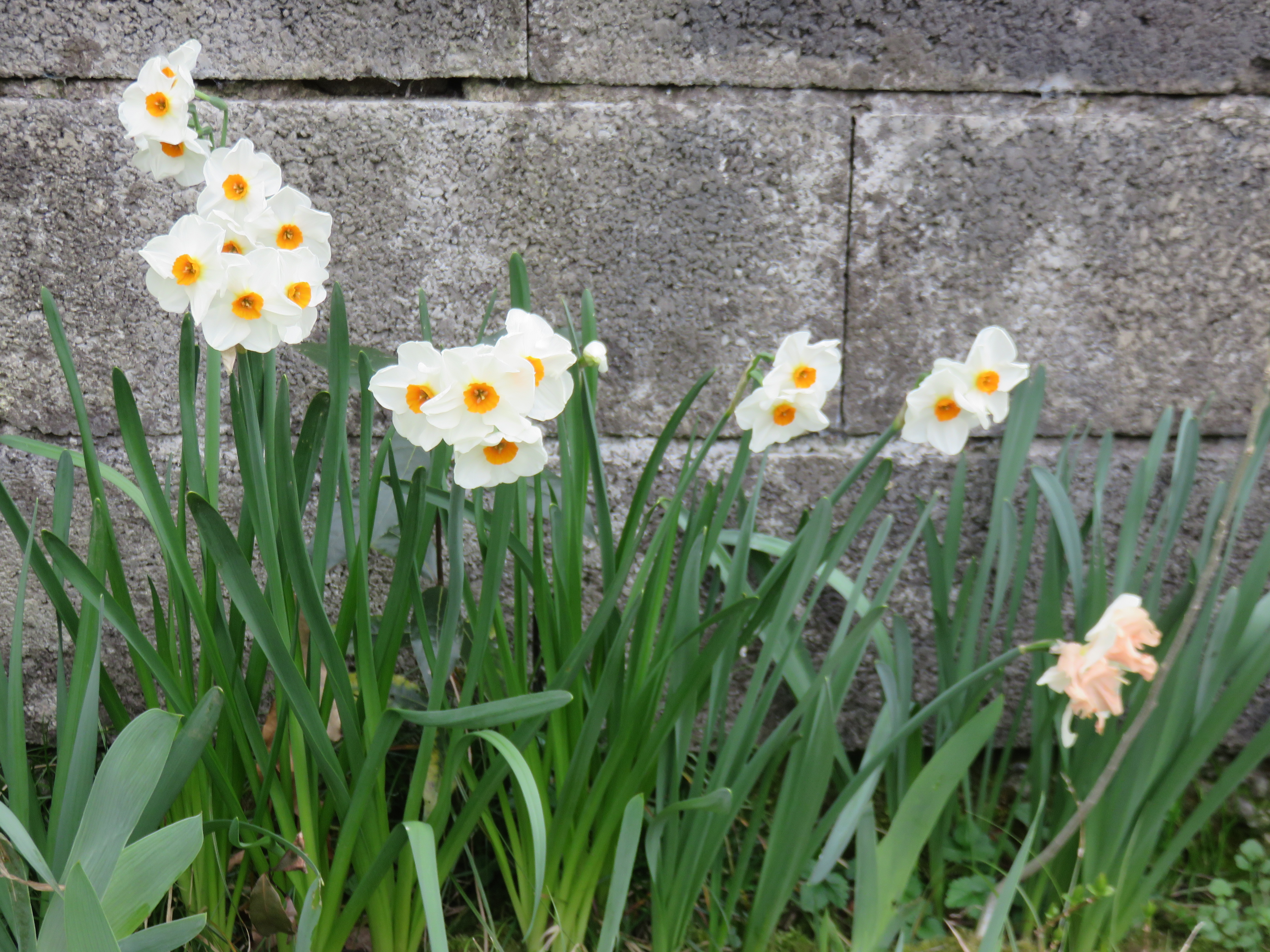 Dans ses bacs, pas encore de géraniums mais des pensées, dont mes préférées : petites et bicolores. Et dans l'herbe de son jardin, quelques violettes naissantes et surtout une multitude de primevères.